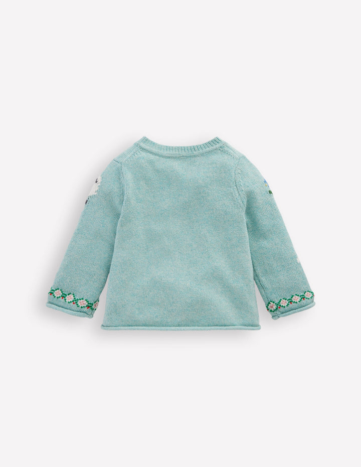 Two children sitting on a bench in a garden, wearing patterned sweaters.