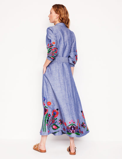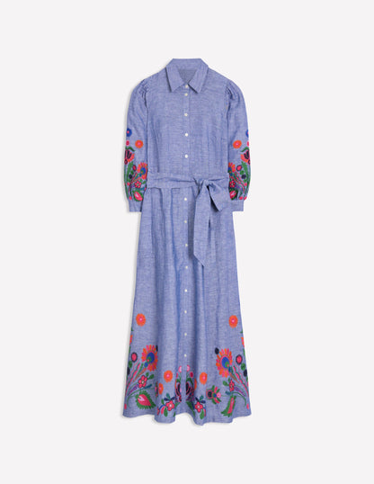 Clara Linen Blend Shirt Dress Blue Chambray, Embroidered