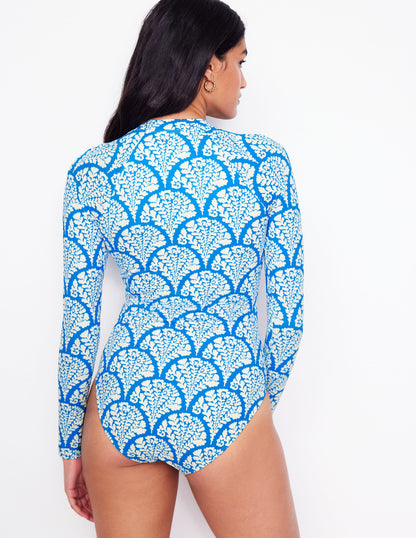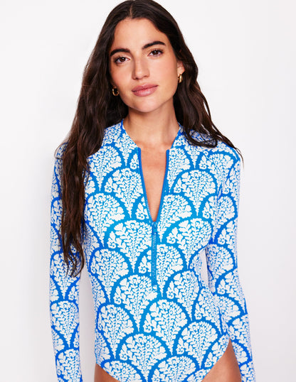 This raglan swimsuit features a handy front zip, removable cups and long sleeves for added coverage when you're out in . . . more