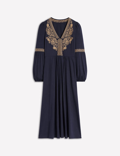 V-Neck Blouson Midi Dress Navy