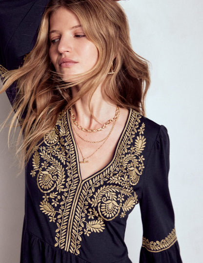V-Neck Blouson Midi Dress-Navy